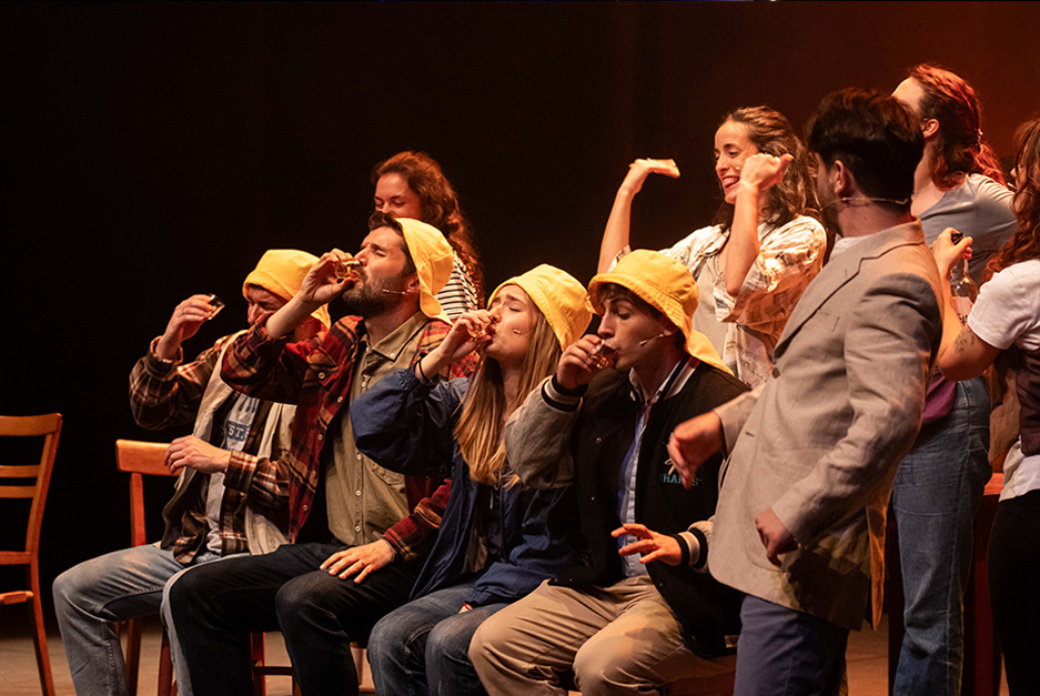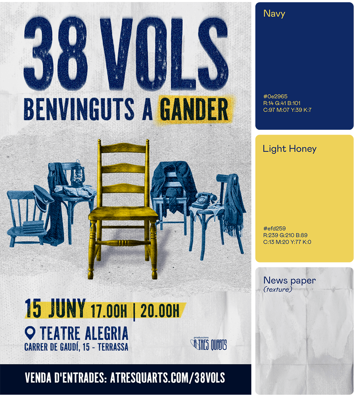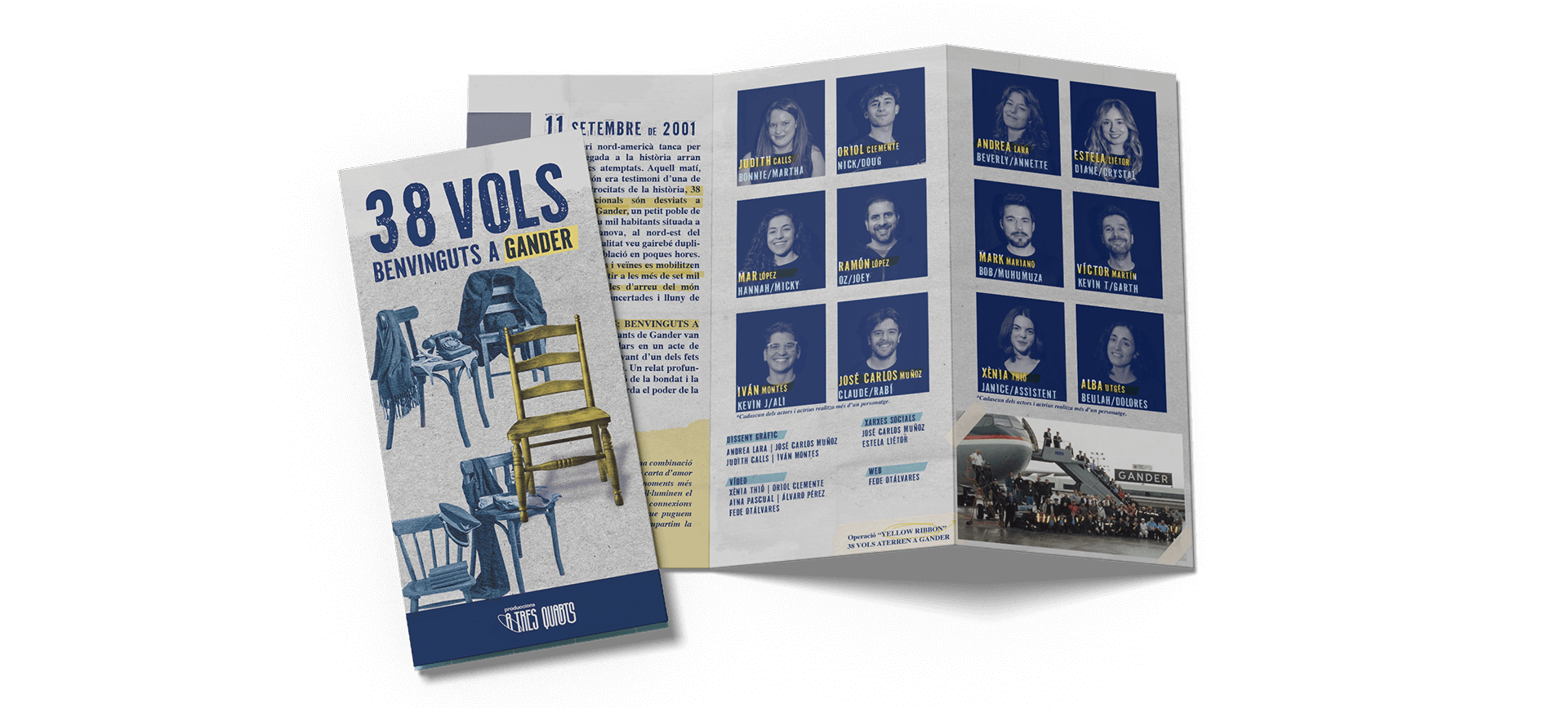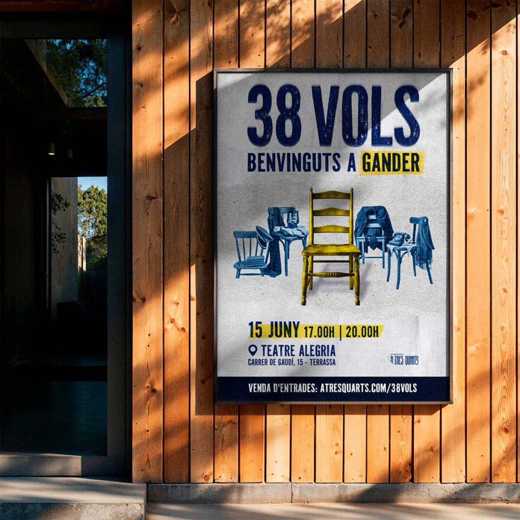 38 Vols: Benvinguts a gander cuenta la historia real de Gander (Terranova), donde miles de personas fueron acogidas tras los atentados del 11-S. En A Tres Quarts adaptamos la obra al catalán, y asumí la responsabilidad gráfica y visual total: diseñé el cartel, realicé las fotografías del elenco, compuse el tríptico del espectáculo y dirigí el arte escénico (movimientos escénicos, vestuario, luces, escenografía).
