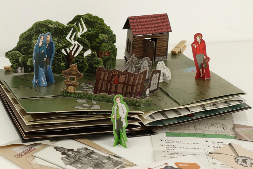 Crime Unfolds es un escape game en formato libro pop-up compuesto por 8 capítulos interactivos que combinan narrativa, puzzles físicos, animaciones 2D y diseño tridimensional.